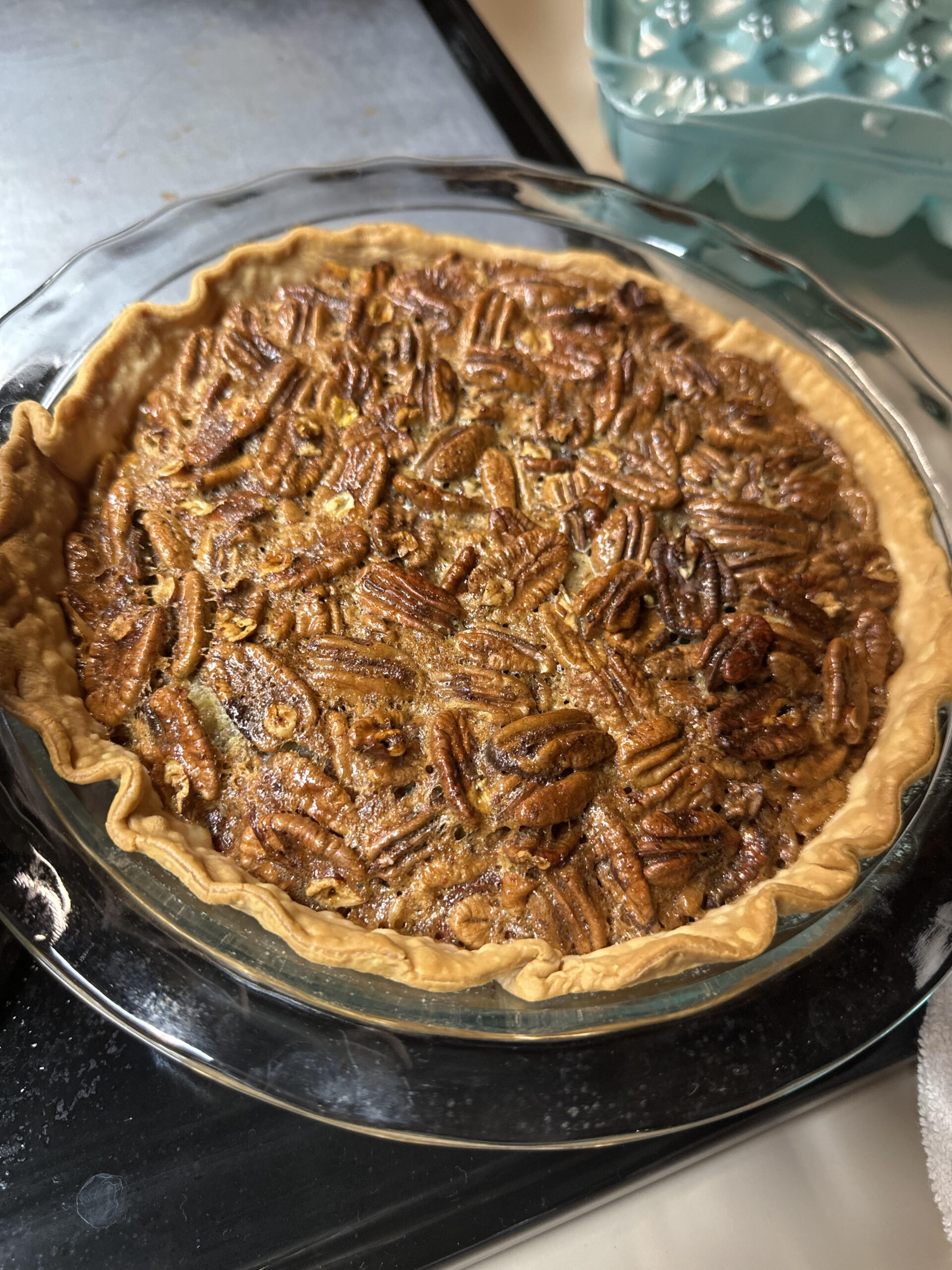 - Stir in pecan halves and then pour into an unbaked pastry shell.